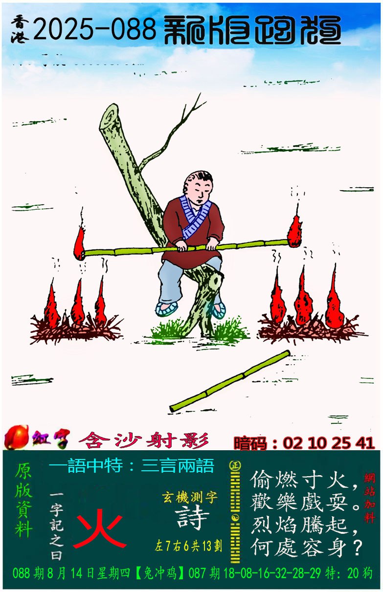 088期:新版跑狗一字記之曰【火】 玄機測字:【詩】
