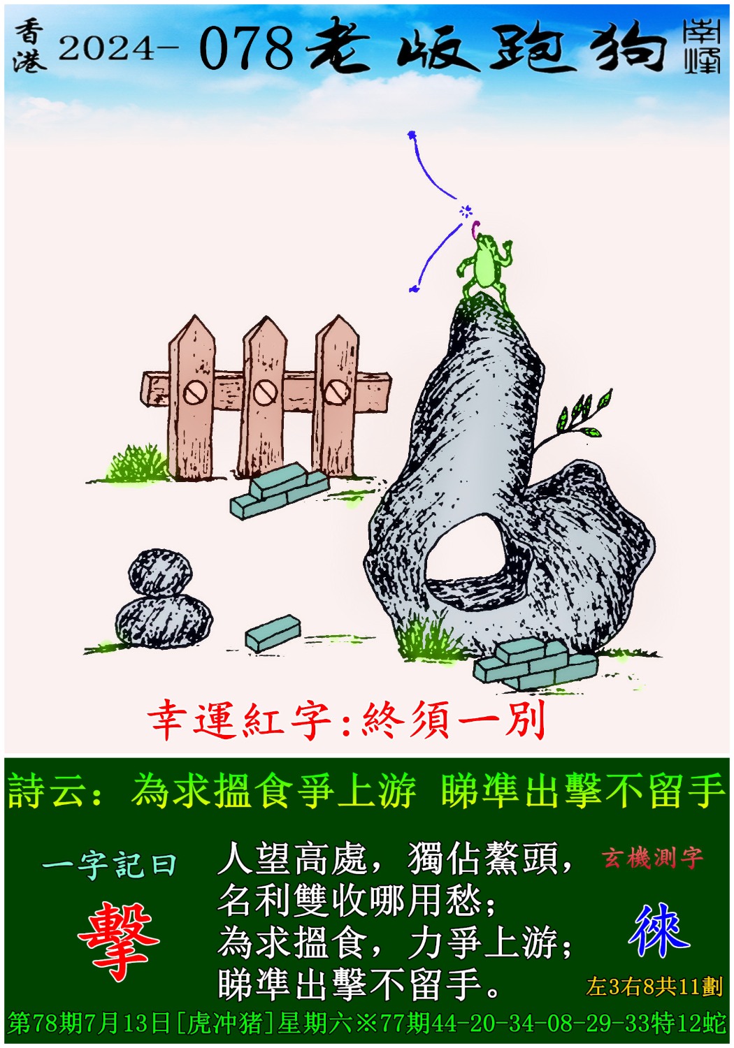 078期老版跑狗一字記之曰:【擊】 玄機測字:《徠》