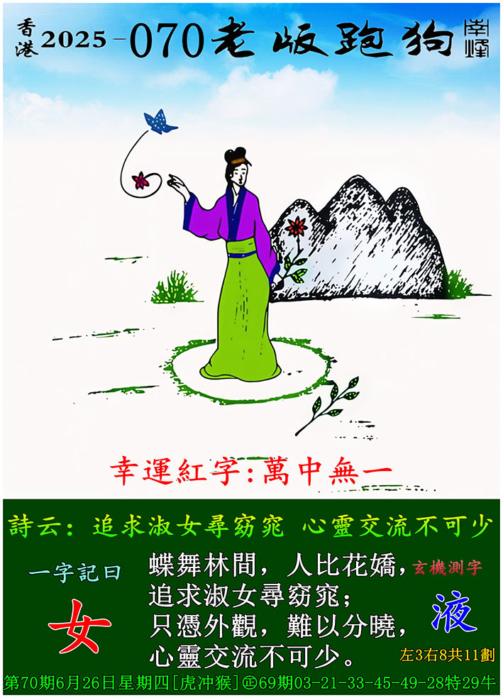 070期老版跑狗一字記之曰:【女】 玄機測字:《液》