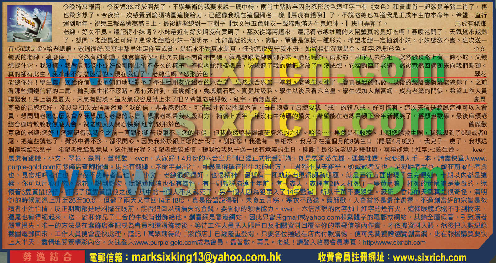 【4】老總你好!學生第一次給你信,也不知道地址對不?學生經朋友介紹看的六合皇,果然六合界第一準料。老總你太神了,簡直是我的偶像,以後的菸酒錢就靠老總你了。之前看那些爛鐵信箱的二尾,輸到學生慘不忍睹。還有死曾狗,畫幾條狗,幾塊爛石頭。真是垃圾料。學生以後只看六合皇。學生想加入創富網,成為老總的門徒,希望工作人員聯繫我!馬上就是夏天,天氣有點熱。這火氣很容易就上來了吧?希望老總賜教,紅字,箭無虛發。 ---豪哥