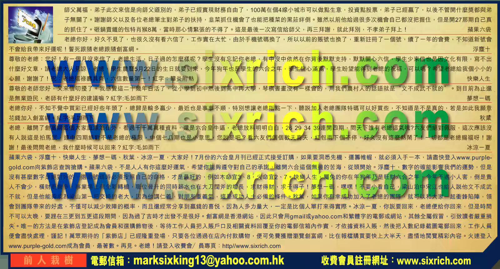 【3】尊敬的老總:您好!有一個月沒來信了,老總生活,日子過的怎麼樣呢?學生沒有忘記你老總,有中沒中依然在你背後默默支持,默默關心六信, 學生少來信也是因文化有限,寫不出什麽好文章,請老總大人見諒,老總,學生農曆5月22日的生日就要到來,今年狗年也是學生的六合之年,學生信心滿滿,學生盼望能得到老總的祝福,可以嗎?希望老總給我個婆婆的心願,謝謝了!祝:老總福祿壽具齊,六信數量第一!紅字:攀炎附熱 ---快樂人生