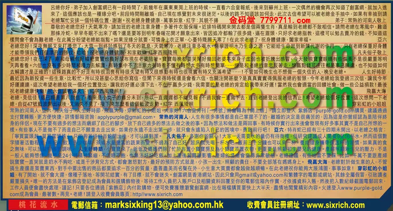 【5】最近因為新投资一些生意,比較化,所以沒甚麼心思給你寫信,但閒下來得時候還是會看六信,也關注開甚麼?是真真實實得佩服老總的智慧,今年老總給我登過三次信,讓我今年好運連連,這次希望老總給我個好位置登出,讓我的好運必须下去,不在乎赢多少錢,我需要的是老總的肯定給我帶來好運!當然我也會適當的回饋社會,做一些公益捐款!最後祝老總健康快樂!祝六信讀者滿天下!紅字西風殘照! ---飛贏大海