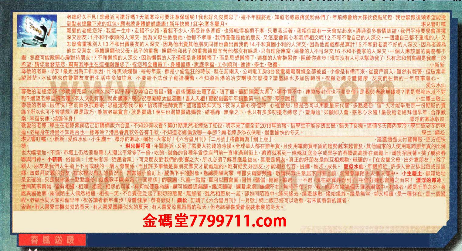 【6】敬爱的老總:學生在老總紫飾店己訂購網版六合星,不知如何收看?第01期果然老總送了紅包,明示來了個全新2019年的猪。惜學生不能参透玄機,錯失了良機。這個冬天國内寒冷,學生感到冬的味道。 老總身在港島不知是否也一樣寒冷?港島春夏秋冬各有千秋,不知道老總偏愛哪一季節?願老總多添衣保暖,過個愉快的冬天。 ---學生:鋼松
