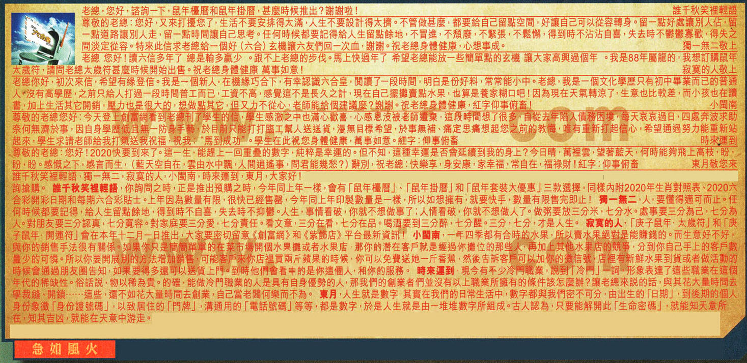 【3】.老總 您好!讀六信多年了 總是輸多贏少 。跟不上老總的步伐。馬上快過年了 希望老總能放一些簡單點的玄機 讓大家高興過個年 。我是88年屬龍的,我想訂購鼠年太歲符,請問老總太歲符甚麼時候開始出售。祝老總身體健康 萬事如意!    寂寞的人敬上
