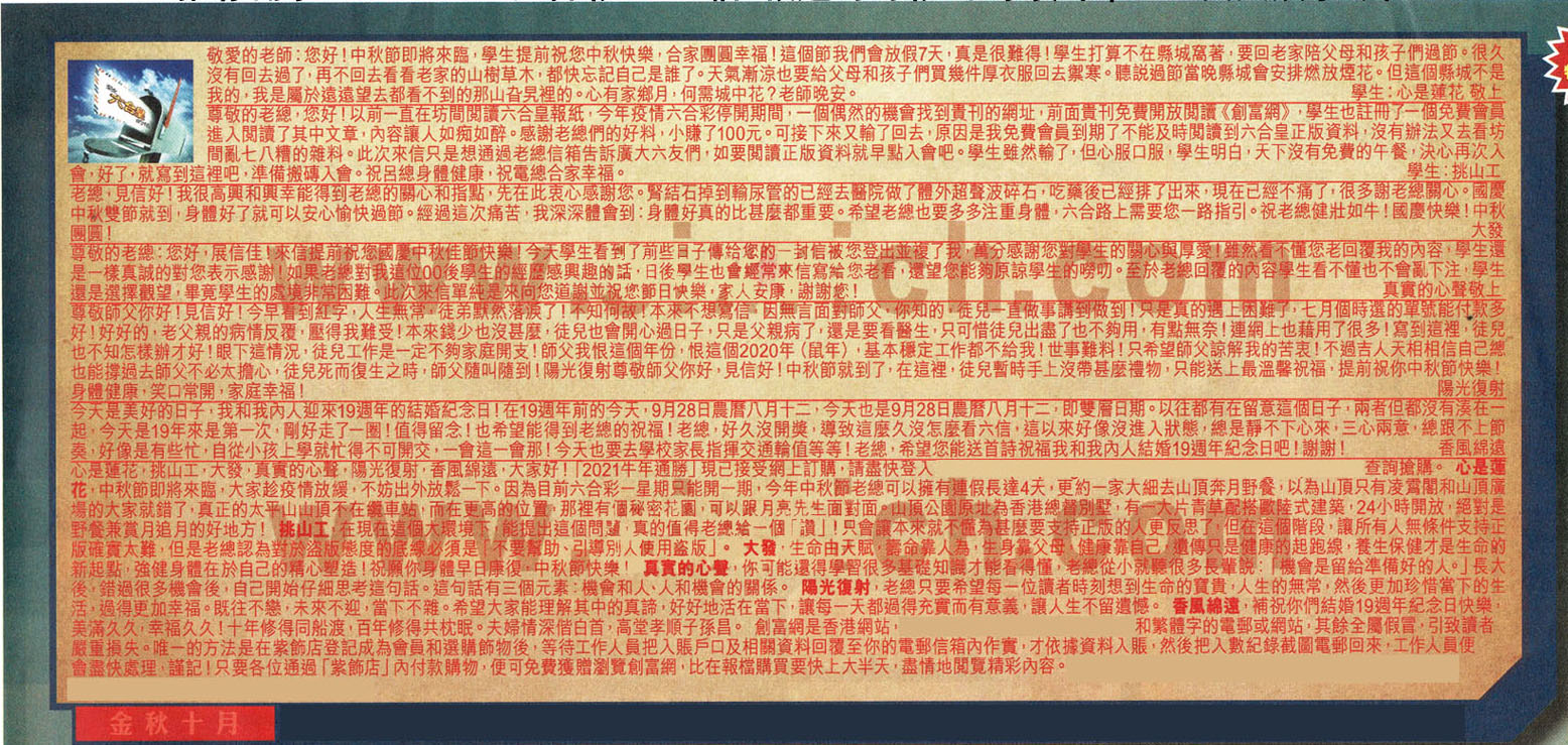 心是蓮花,挑山工,大發,真實的心聲,陽光復射,香風綿還,大家好! 【1】敬爱的老師:您好!中秋節即将来臨,學生提前祝您中秋快樂:合家團圓幸福|這個節我们會放假7天,真是很難得!學生打算不在縣城窩著,要回老家陪父母和孩子們過節。很久没有回去過了,再不回去看看老家的山樹草木,都快忘記自己是誰了,天氣渐凉也要給父母和孩子們買幾件厚衣服回去禦寒。聽说過節當晚縣城會安排燃放煙花。但這個縣城不是我的,我是屬於遠遠望去都看不到的那山旮旯裡的。心有家鄉月,何需城中花?老師晚安。 ---學生:心是蓮花 敬上 →〖心是蓮花〗:中秋節即將來臨,大家趁疫情放缓,不妨出外放鬆一下。因為目前六台彩一星期只能開一期,今年中秋節老總可以擁有連假長達4天,更約一家大細去山頂奔月野餐,以為山頂只有凌霄閣和山頂廣場的大家就錯了,真正的太平山山頂不在缆車站:而在更高的位置,那裡有个秘密花園,可以跟月亮先生面對面,山頂公園原址為香港總督別墅,有一大片青草配搭歐陸式建築,24小時開放,絕對是野餐兼賞月追月的好地方! 【2】尊敬的老總,您好!以前一直在坊間閱讀六合皇報紙,今年疫情六合彩停開期間, 一個偶然的機會我到贵刊的網址 前面貴刊免費開放閱讀《創富網》,學生也赶冊了一個免费會員進入閱讀了其中文章,內容讓人如痴如醉。感谢老總們的好料,小赚了100元。可接下來又輸了回去;原因是我免费會员到期了不能及時閱讀到六合皇正版資料,沒有辦法又去看坊間亂七八糟的雜料。此次來信只是想通過老總信箱告訴廣大六友們,如要閱讀正版資料就早點入會吧。學生雖然輸了,但心服口服,學生明白,天下沒有免费的午餐,決心再次入會,好了,就寫到這裡吧,準備搬磚入會。祝呂總身體健康,祝電總合家幸福。 ---學生:挑山工 →〖挑山工〗:在現在這個大環境下; 能提出這個問题,真的值得老總給一個「讚」!只會讓本來就不懂為甚麼要支持正版的人更反思了,但在這個階段,讓所有人無條件支持正版確實太難,但是老總認為對於盗版態度的底線必须是「不要幫助、引導别人使用盗版」。 【3】老總,見信好!我很高興和興幸能得到老總的關心和指點,先在此衷心感期您。肾结石掉到輸尿管的已經去醫院做了體外超聲波碎石,吃藥後已經排了出來,現在已經不痛了,很多謝老總關心。國慶中秋雙節就到;身體好了就可以安心愉快過節。經過這次痛苦,我深深體會到:身體好真的比甚麼都重要。希望老總也要多多注重身體,六合路上需要您路指引。 祝老總健壯如牛!國慶快樂!中秋明圆! ---大發 →〖大發〗:生命由天賦,壽命靠人為,生身靠父母,健康靠自己,遺傅只是健康的起跑線,養生保健才是生命的新起點,強健身體在於自己的精心塑造!祝顯你身體早日康復,中秋節快樂! 【4】尊敬的老總:您好,展信佳!来信提前祝您國慶中秋佳節快樂!今天學生看到了前些日子博给您的封信被您登出並複了我,萬分感谢您对學生的關心與厚爱!虽然看不懂您老回覆我的内容、學生還是一樣真誠的對您表示感謝!如果老總對我這位00後學生的經歷感興趣的話,日後学生也會经常来信寫給您老看,還望您能夠原諒學生的嘮叨。至於老總回覆的内容學生看不懂也不會亂下注,學生還是選擇觀望,畢竟學生的處境非常困難。此次來信單純是来向您道謝並祝您節日快樂,家人安康:謝謝您! ---真實的心聲敬上 →〖真實的心聲〗:你可能還得學習很多基礎知識才能看得懂,老總從小就聽很多長輩說:「機會是留給準備好的人」長大後,錯過很多機會後,自己開始仔細思考這句話o這句話有三個元素:機會和人、人和機會的關係。 【5】尊敬師父你好!見信好!今早看到紅字,人生無常,徒弟默然落淚了!不知何故!本来不想寫信;因無言面對師父.你知的,徒兒一直做事講到做到!只是真的遇上困難了,七月個時選的單號能付款多好!好好的,老父親的病情反覆,壓得我難受!本來錢少也沒甚麼,徒兒也會開心過日子,只是父親病了,還是要看醫生;只可惜徒兒出盡了也不夠用,有點無奈!連網上也藉用了很多!寫到這裡,徒兒也不知怎樣辦才好!眼下這情况,徒兒工作是一定不夠家庭開支!師父我恨這個年份;恨這個2020年(鼠年),基本稳定工作都不给我!世事難料!只希望師父諒解我的苦衷!不過吉人天相相信自己想也能撑過去師父不必太擔心,徒兒死而復生之時,師父随叫随到!陽光復射尊敬師父你好,見信好!中秋節就到了,在這裡,徒兒暫時手上沒帶甚麼禮物,只能送上最温馨祝福,提前祝你中秋節快樂!身體健康,笑口常開,家庭幸福 ---陽光復射 →〖陽光復射〗:老總只要希望每一位讀者時刻想到生命的寶貴,人生的無常,然後更加珍惜當下的生活,過得更加幸福。既往不戀,未來不迎,當下不雜。希望大家能理解其中的真諦,好好地活在當下,讓每一天都過得充實而有意義 ,讓人生不留遭憾。 【6】今天是美好的日子:我和我内人迎來19週年的結婚紀念日!在19週年前的今天,9月28日農曆八月十二,今天也是9月28日農曆八月十二,即雙層日期。以往都有在留意這個日子,兩者但都没有凑在一起,今天是19年來是第一次,剛好走了一圈!值得留念!也希望能得到老總的祝福!老總;好久沒開獎,導致這摩久沒怎麼看六信,這以來好像沒進入狀態;總是靜不下心來,三心兩意,總跟不上節奏,好像是有些忙,自從小孩上學就忙得不可開交,一會這一會那!今