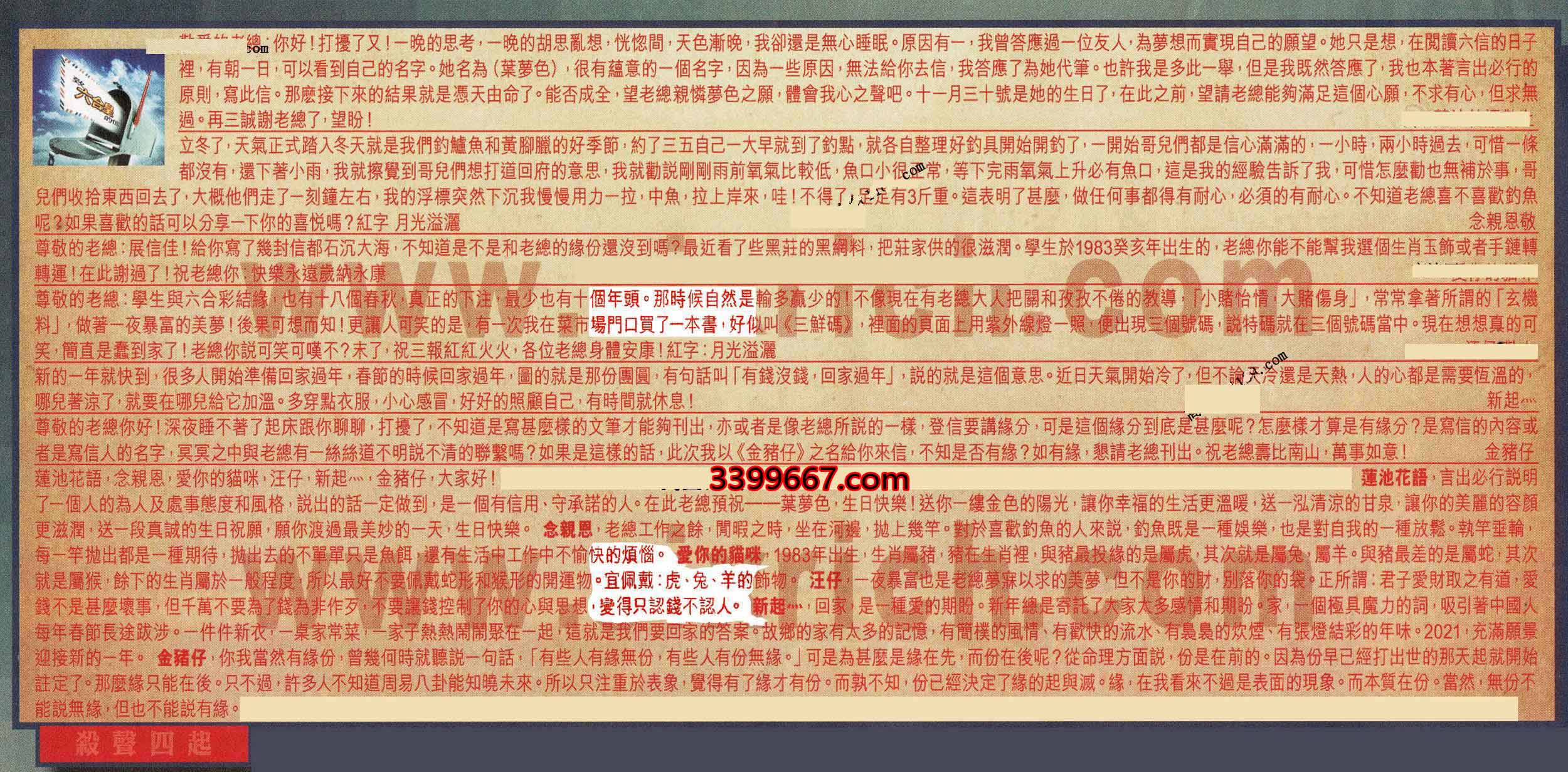 【6】.尊敬的老總你好!深夜睡不著了起床跟你聊聊,打擾了,不知道是寫甚麼樣的文肇才能夠刊出,亦或者是像老總所說的一樣,登信要講緣分,可是這個緣分到底是甚麼呢?怎麼樣才算是有緣分?是寫信的内容或者是寫信人的名字,冥冥之中與老總有一絲絲道不明說不清的聯緊嗎?如果是這樣的話,此次我以《金猪仔》之名給你來信,不知是否有緣?如有緣,懇請老總刊出。祝老總壽比南山,萬事如意!   金猪仔
