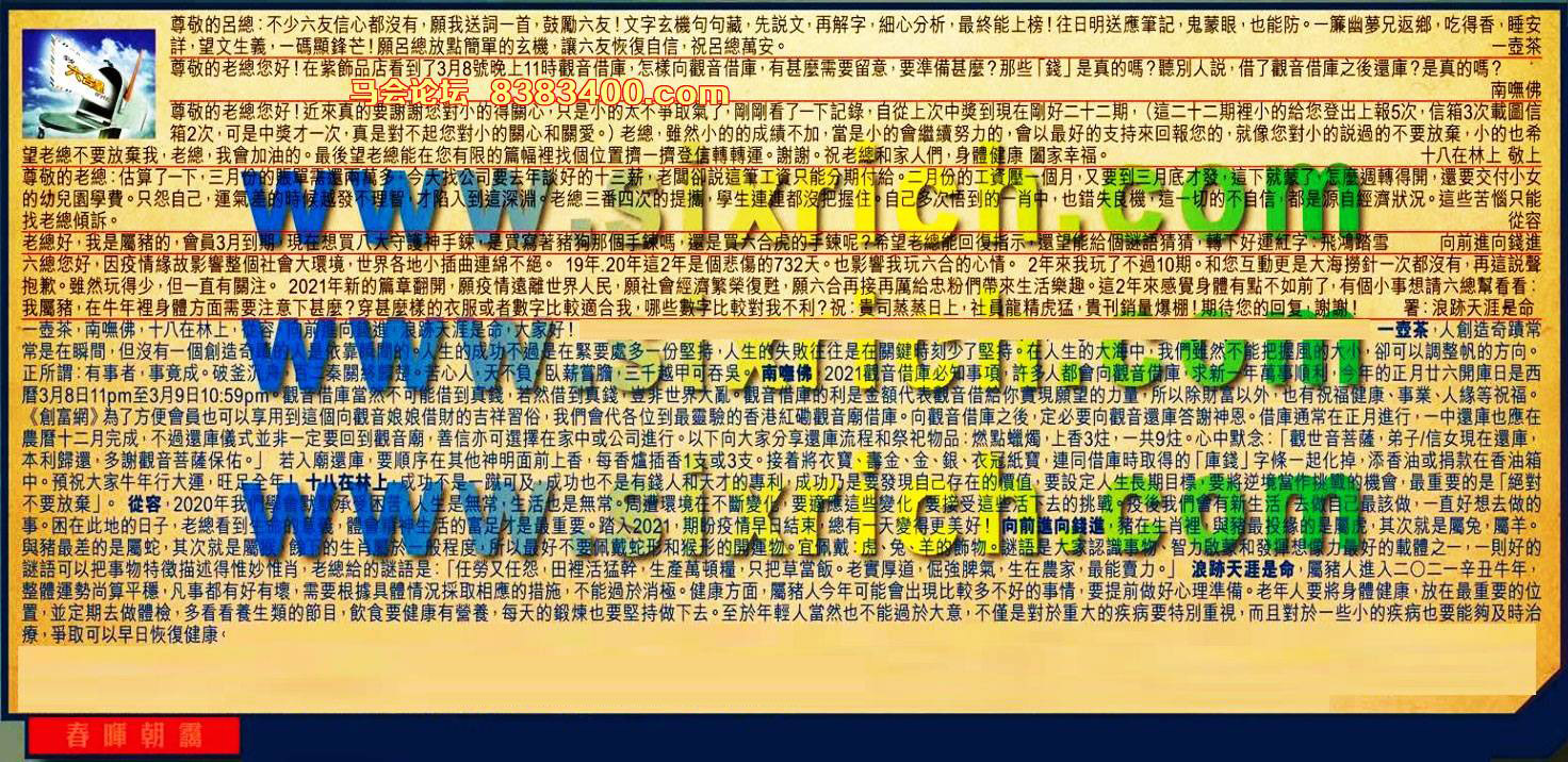 【6】.六總您好,因疫情緣故影響整個社會大環境,世界各地小插曲連綿不絕。19年.20年這2年是個悲傷的732天。也影響我玩六合的心情。2年來我玩了不過10期。和您互動更是大海撈針一次都沒有,再這說聲抱歉。雖然玩得少,但一直有關注。2021年新的篇章翻開,願疫情遠離世界人民,願社會經濟繁榮復甦,願六合再接再厲給忠粉們帶來生活樂趣。這2年來感覺身體有點不如前了,有個小事想請六總幫看看:我屬豬,在牛年裡身體方面需要注意下甚麼?穿甚麼樣的衣服或者數字比較適合我,哪些數字比較對我不利?祝:貴司蒸蒸日上,社員龍精虎猛,貴刊銷量爆棚!期待您的回复,謝謝! 署: 浪跡天涯是命