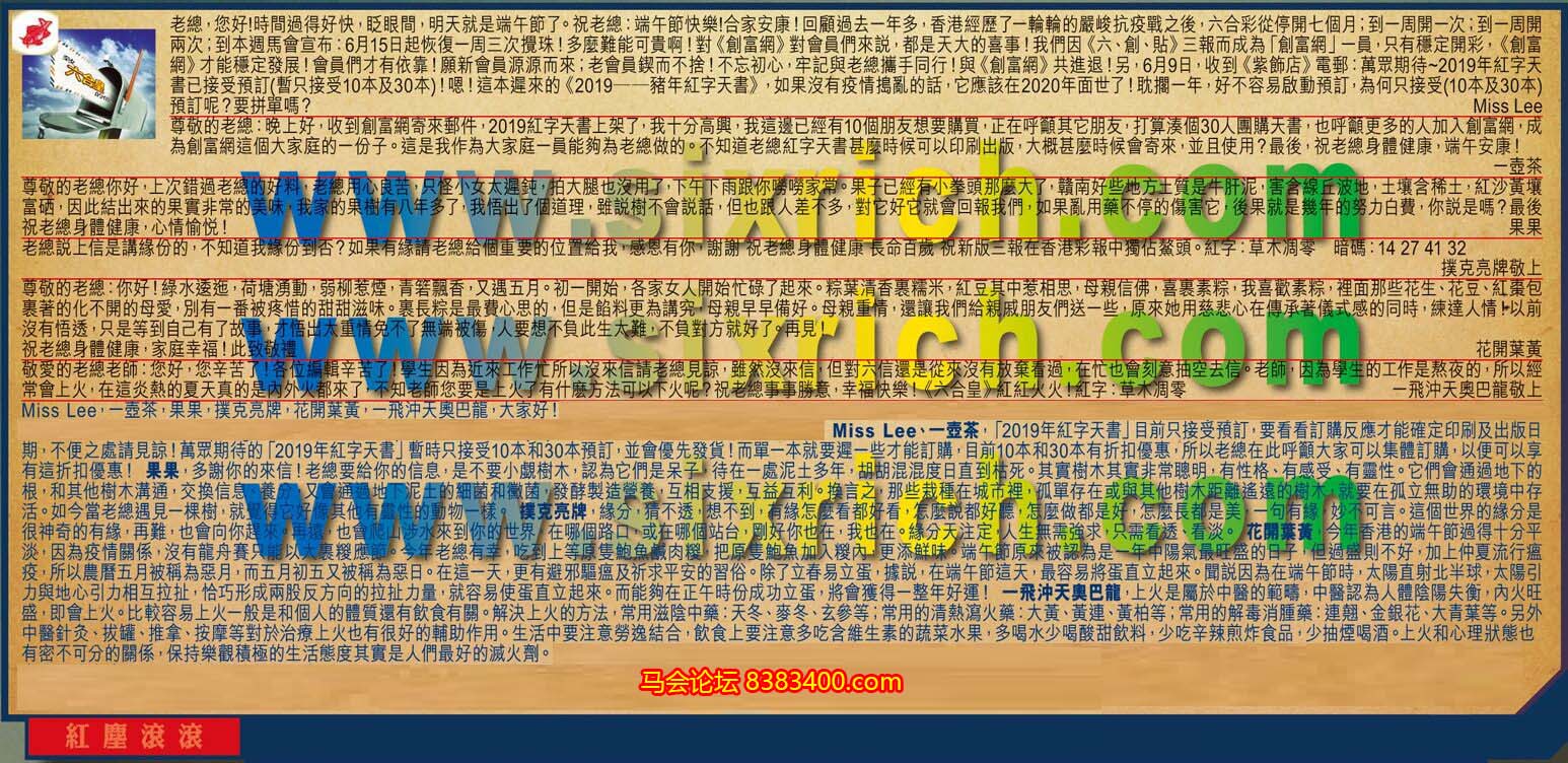 【1】.老總,您好!時間過得好快,眨眼間,明天就是端午節了。祝老總:端午節快樂!合家安康!回顧過去一年多,香港經歷了一輪輪的嚴峻抗疫戰之後,六合彩從停開七個月;到一周開一次;到一周開兩次;到本週馬會宣布:6月15日起恢復一周三次攪珠!多麼難能可貴啊!對《創富網》對會員們來說,都是天大的喜事!我們因《六、創、貼》三報而成為「創富網」一員,只有穩定開彩,《創富網》才能穩定發展!會員們才有依靠!願新會員源源而來;老會員鍥而不捨!不忘初心,牢記與老總攜手同行!與《創富網》共進退!另,6月9日,收到《紫飾店》電郵:萬眾期待~2019年紅字天書已接受預訂(暫只接受10本及30本)!嗯!這本遲來的《2019——豬年紅字天書》,如果沒有疫情搗亂的話,它應該在2020年面世了!耽擱一年,好不容易啟動預訂,為何只接受(10本及30本)預訂呢?要拼單嗎?  Miss Lee