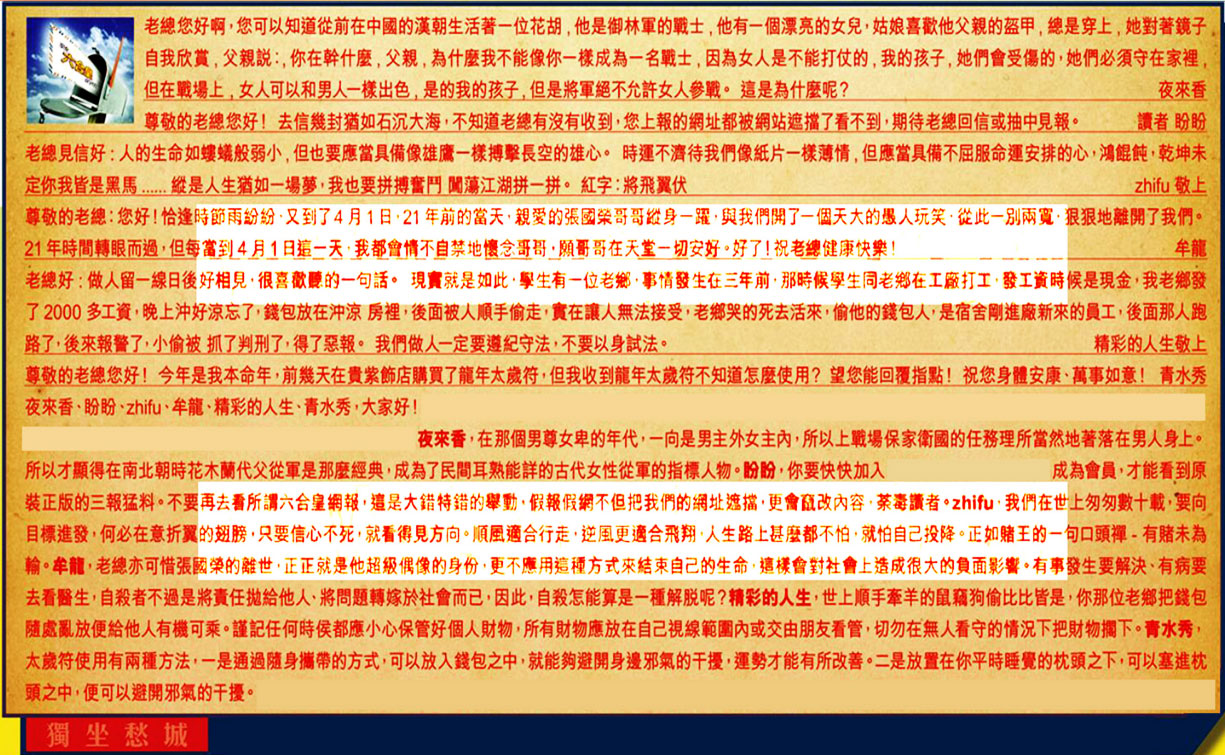 043期:彩民推荐六合皇信箱(紅字:獨坐愁城)