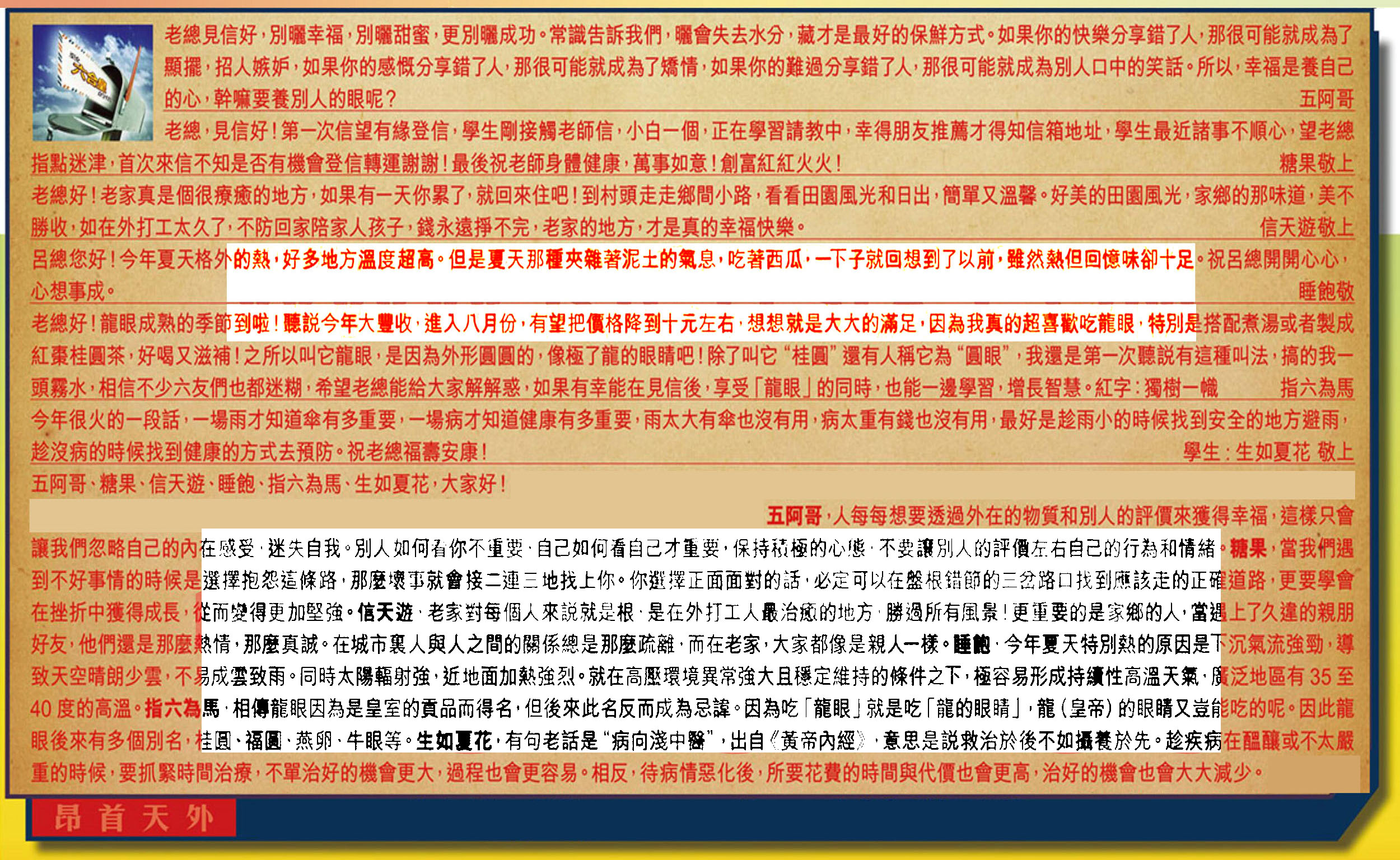 【5】.老總好!龍眼成熟的季節到啦!聽說今年大豐收,進入八月份有望把價格降到十元左右,想想就是大大的滿足,因為我真的超喜歡吃龍眼,特別是搭配煮湯或者製成紅棗桂圓茶,好喝又滋補!之所以叫它龍眼,是因為外形圓圓的,像極了龍的眼睛吧!除了叫它“桂圆”還有人稱它為“圓眼”,我還是第一次聽說有這種叫法,搞的我一頭霧水,相信不少六友們也都迷糊,希望老總能給大家解解惑,如果有幸能在見信後,享受「龍眼」的同時,也能一邊學習 ,增長智慧。紅字:獨樹一幟 指六為馬