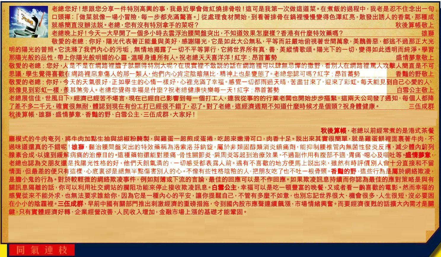 【6】.老總展信佳,世風日下,經濟已經苦不堪言,現在已經自己影響到每一個打工人,連我從事的的行業老闆也開始步步摳緊,這兩天公司發了通知,每個人都降了差不多二千元,確實很無耐,體認到現在有份工打已經很不錯了,忍了。對了老總,這經濟週期不知道什麼時候才是個頭?祝身體健康。 三伍成群