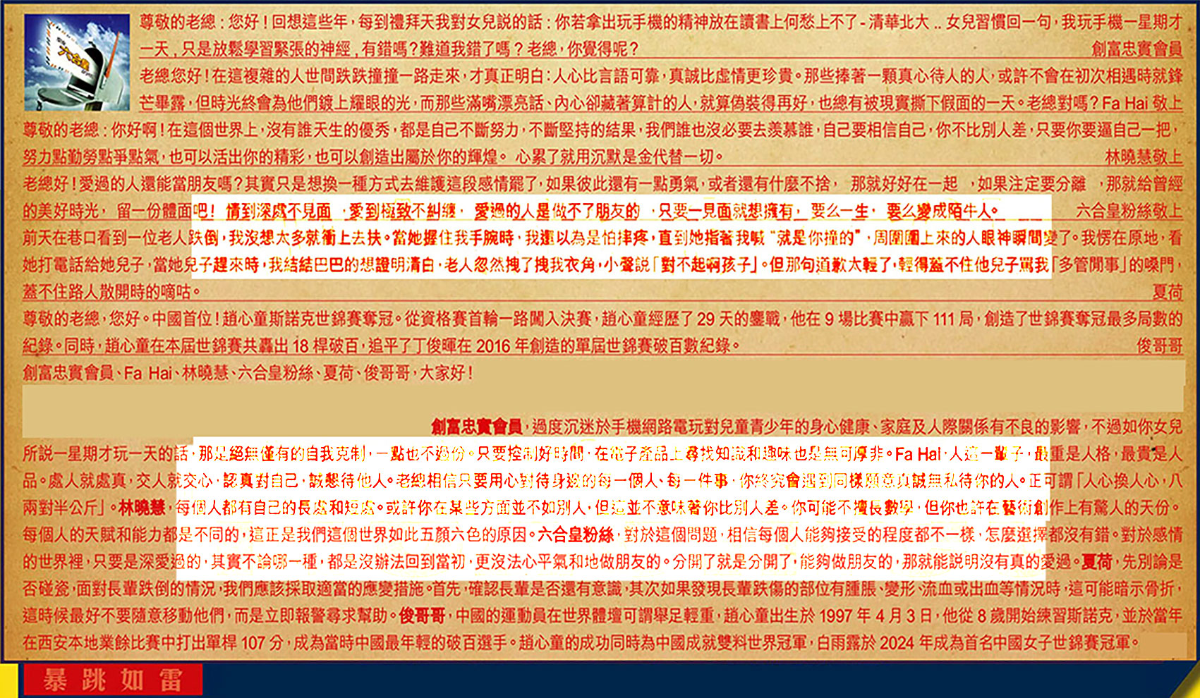【2】.老總您好!在這複雜的人世間跌跌撞撞一路走來,才真正明白:人心比言語可靠,真誠比虛情更珍贵。那些捧著一顆真心待人的人,或許不會在初次相遇時就鋒芒畢露,但時光終會為他們鍍上耀眼的光,而那些滿嘴漂亮話、內心卻藏著算計的人,就算偽装得再好,也總有被現實撕下假面的一天。老總對嗎?  Fa Hai 敬上