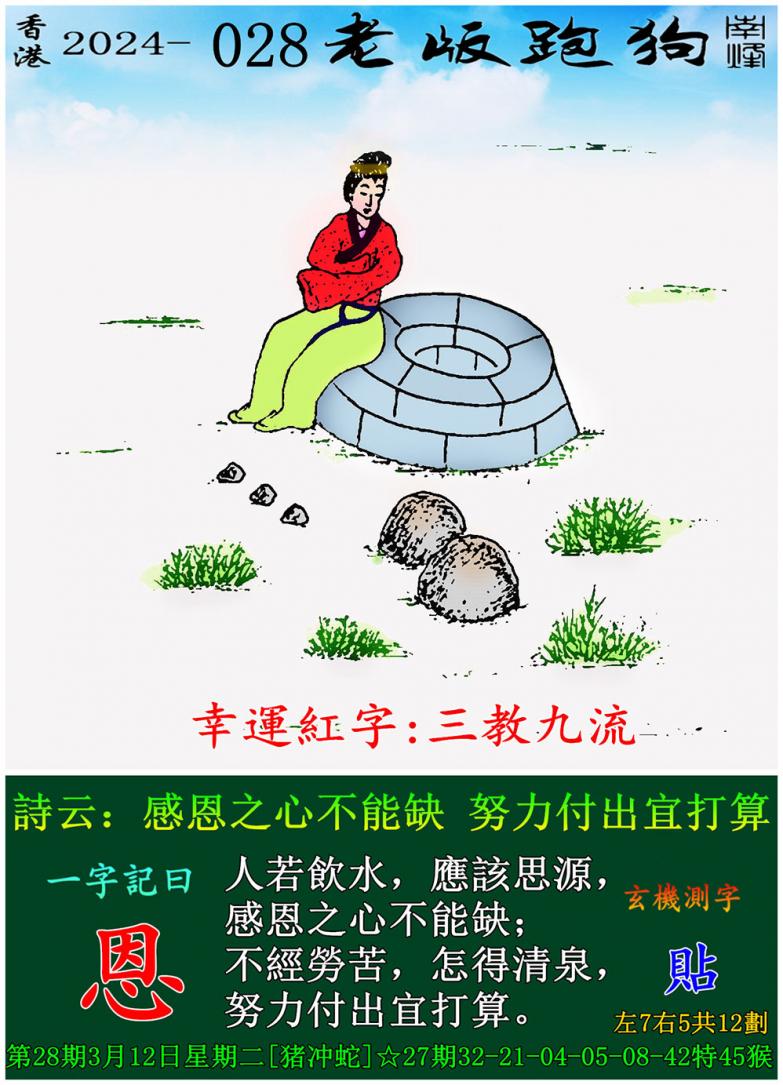 028期老版跑狗一字記之曰:【恩】 玄機測字:《貼》