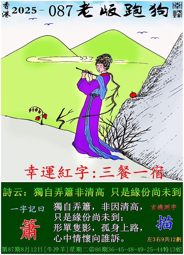 087期老版跑狗一字記之曰:【簫】 玄機測字:《描》