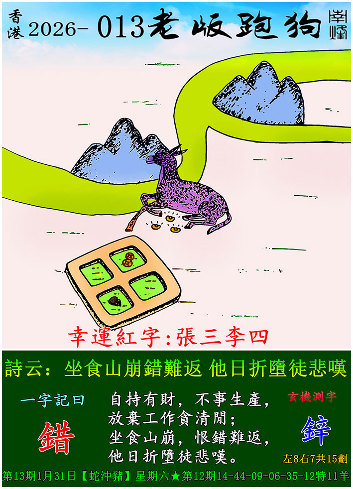 主题 : 013期老版跑狗一字記之曰:【錯】 玄機測字:《鋅》