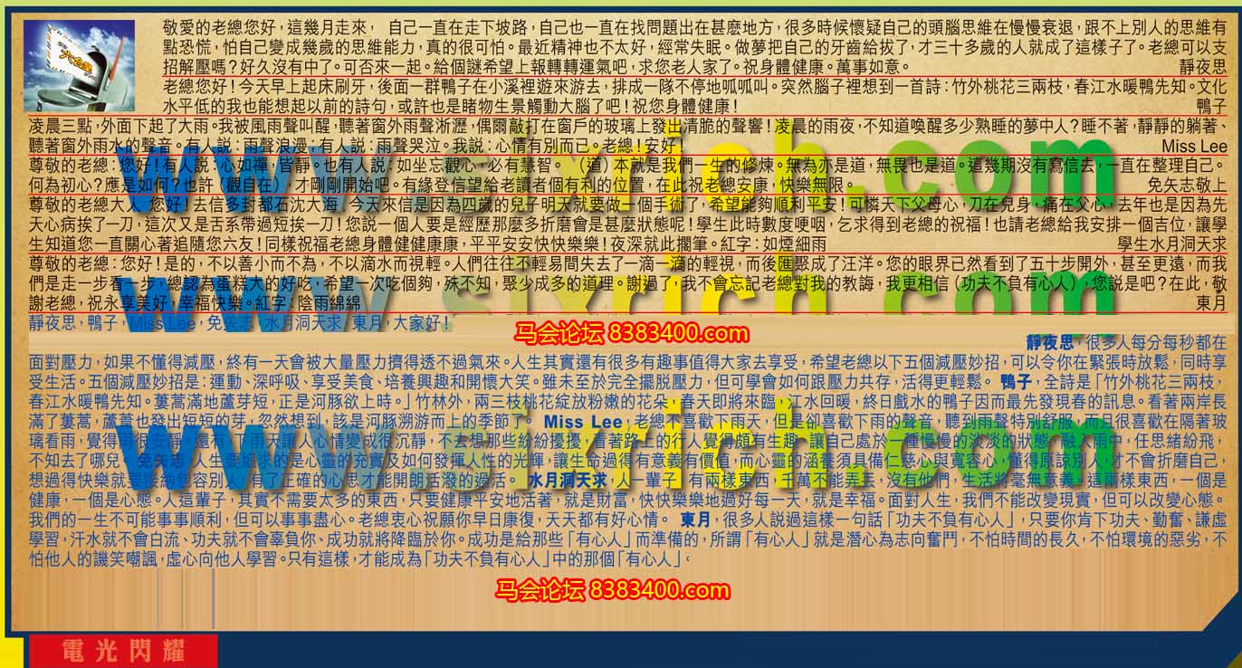 【1】.敬愛的老總您好,這幾月走來,自己一直在走下坡路,自己也一直在找問題出在甚麼地方,很多時候懷疑自己的頭腦思維在慢慢衰退,跟不上別人的思維有點恐慌,怕自己變成幾歲的思維能力,真的很可怕。最近精神也不太好,經常失眠。做夢把自己的牙齒給拔了,才三十多歲的人就成了這樣子了。老總可以支招解壓嗎?好久沒有中了。可否來一起。給個謎希望上報轉轉運氣吧,求您老人家了。祝身體健康。萬事如意。    靜夜思