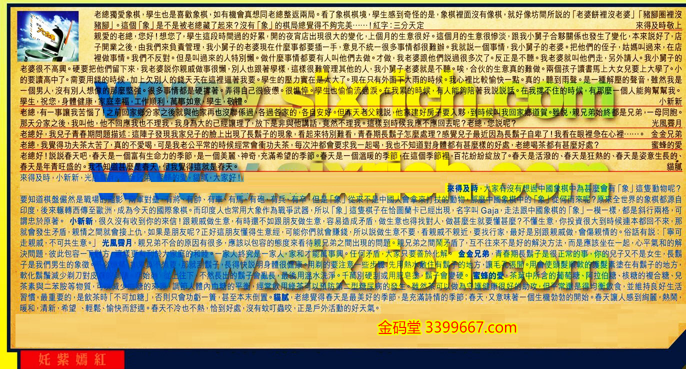 【1】.老總獨愛象棋,學生也是喜歡象棋,如有機會真想同老總整返兩局。看了象棋棋境,學生感到奇怪的是,象棋裡面沒有像棋,就好像坊間所說的「老婆餅裡沒老婆」「豬腳圈裡沒猪腳」。這個「象」是不是被老總藏了起來?沒有「象」的棋局總覺得不夠完美......!紅字:三分天定  來得及時敬上