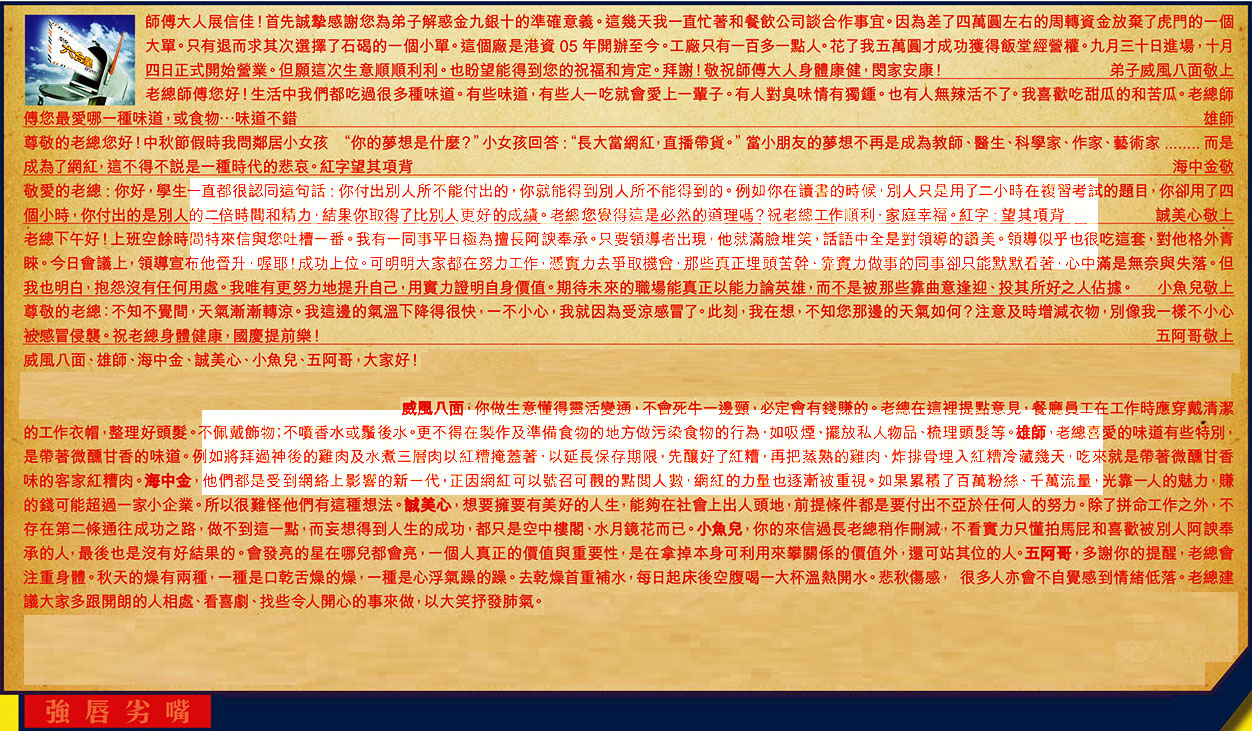 【1】.師傅大人展信佳!首先誠摯感謝您為弟子解惑金九銀十的準確意義。這幾天我一直忙著和餐飲公司談合作事宜。因為差了四萬圓左右的周轉資金放棄了虎門的一個大單。只有退而求其次選擇了石碣的一個小單。這個廠是港資 05 年開辦至今。工廠只有一百多一點人。花了我五萬圓才成功獲得飯堂經營權。九月三十日進場,十月四日正式開始營業。但願這次生意順順利利。也盼望能得到您的祝福和肯定。拜謝!敬祝師傅大人身體康健,閔家安康!  弟子威風八面敬上